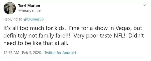 “这对孩子们来说太过了。如果说是在拉斯维加斯的一场表演,那还好。不过肯定不适合一家人观看。NFL太低级趣味了!完全没必要呈现那样的表演。”,一位网友说道。