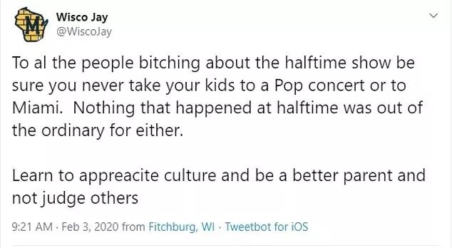“所有批评超级碗中场秀的人,确定你永远不会带孩子去看一场演唱会或者去迈阿密。中场没发生什么,这场秀也没啥与众不同。学会欣赏文化,做更好的家长,别去断然评判别人。”,这位网友写道。