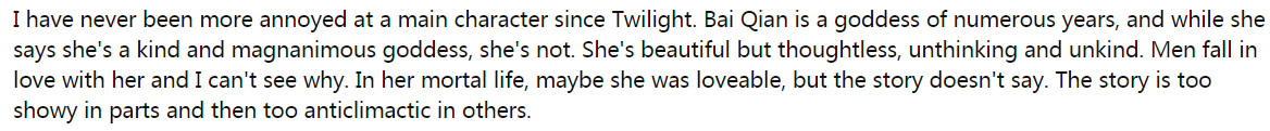 从《暮光之城》之后,我再也没像现在这样讨厌过哪个主角。小说中描写白浅是一个宽宏大量的神,但并不是,虽然她美丽,但轻率、没脑子、不仁慈。
