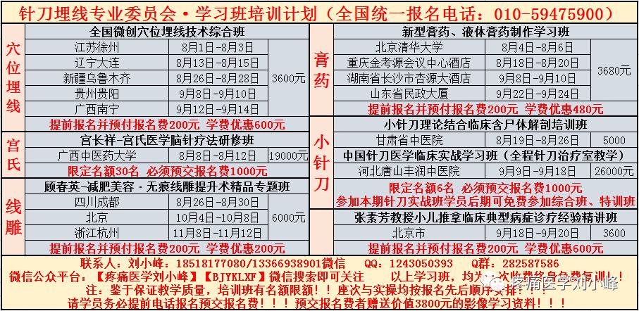 为进一步推广卫生部十年百项推广项目——穴位埋线疗法,更好地推动和发展中医针灸的诊疗技术,加强全国各地区中医针灸医疗单位及其从业医师的交流与合作,由全国针刀埋线委员会主办,北京延康疼痛医学研究院承办,北京王九针刀医学研究院协办,特面向全国推广举办“全国微创穴位埋线治百病技术综合班”。2017年第五十九期全国微创穴位埋线班定于8月13日-8月15日在辽宁大连,现将有关事项通知如下: