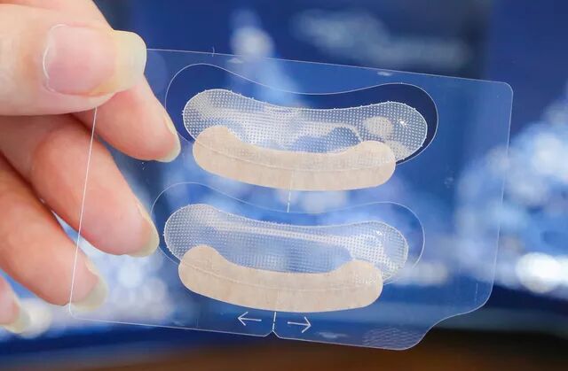 第一步,把透明的微针贴在眼睛下方,用胶带固定;(别贴错了,黄色的是胶带)