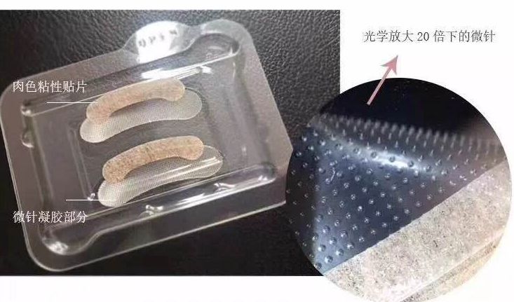 这款眼贴就是把去皱成分(透明质酸+胶原蛋白),用专利技术做成200μm(比头发丝还细200倍)的微针,代替针管射入真皮层(按压射入皮肤的一瞬间,刺刺麻麻的~~)