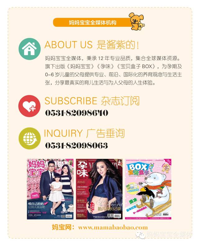 面对汗牛充栋的育儿书,数不胜数的google词条,我们知道妈妈们有着各种疑惑。作为有着十余年历史的母婴科普杂志《妈妈宝宝》&《孕味》,我们会秉着专业的态度,每天向您提供权威实用又靠谱的育儿信息,以及新鲜好玩的有奖活动。