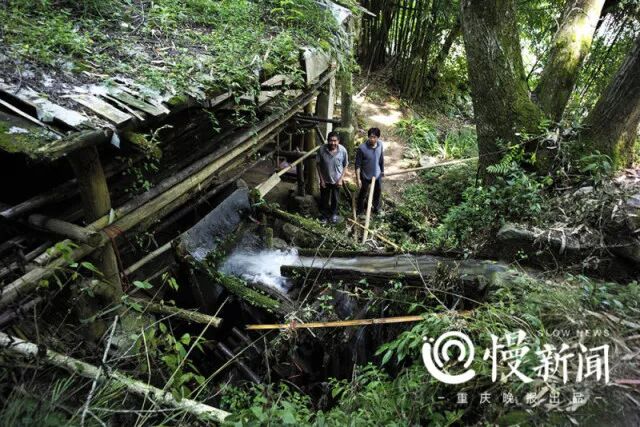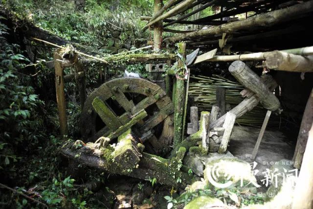 5月17日,奉节县兴隆镇山区的早晨,大洞河河水潺潺而下,浅浅地铺在河床上,像一块绒布在微风下跳动。河床边,一条引流渠轻轻撕开这块“绒布”,水流被引到木质的水车上方,再哗啦啦地流下,推着木轱辘沉重地转了起来,再带动一个巨大的木槌高高抬起,重重落下,砸在扯碎的竹片上,发出一声闷响。