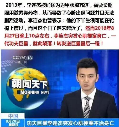27日,李连杰网络上又在疯传李连杰去世的消息,还称新闻联播都播了,并曝出了一组图片,可是明眼人一看就知道图片是假的,但还是有不少网友被骗。