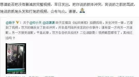 而事件的升华则是因为杨子的一番爆料,他声称自己在第一时间联系了边潇潇,强烈要求印小天向边潇潇道歉,还晒出了视频的截图。视频截图一出,更是闹得沸沸扬扬。