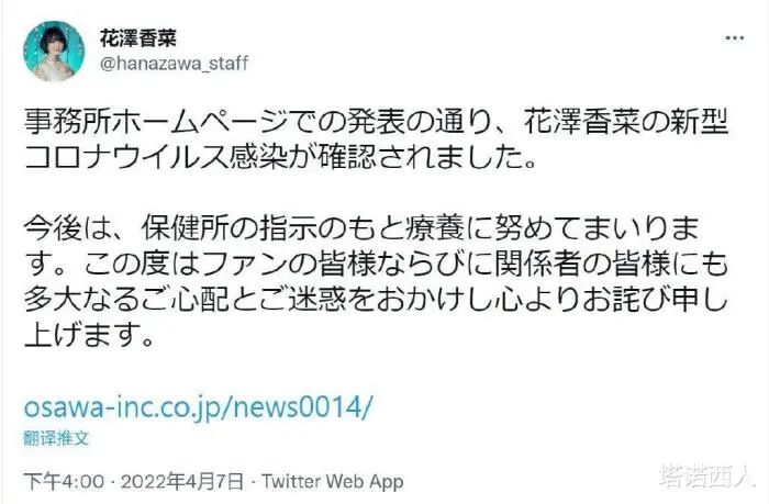 “我们要报告的是,已得到确认我们公司花泽香菜感染新型冠状病毒。