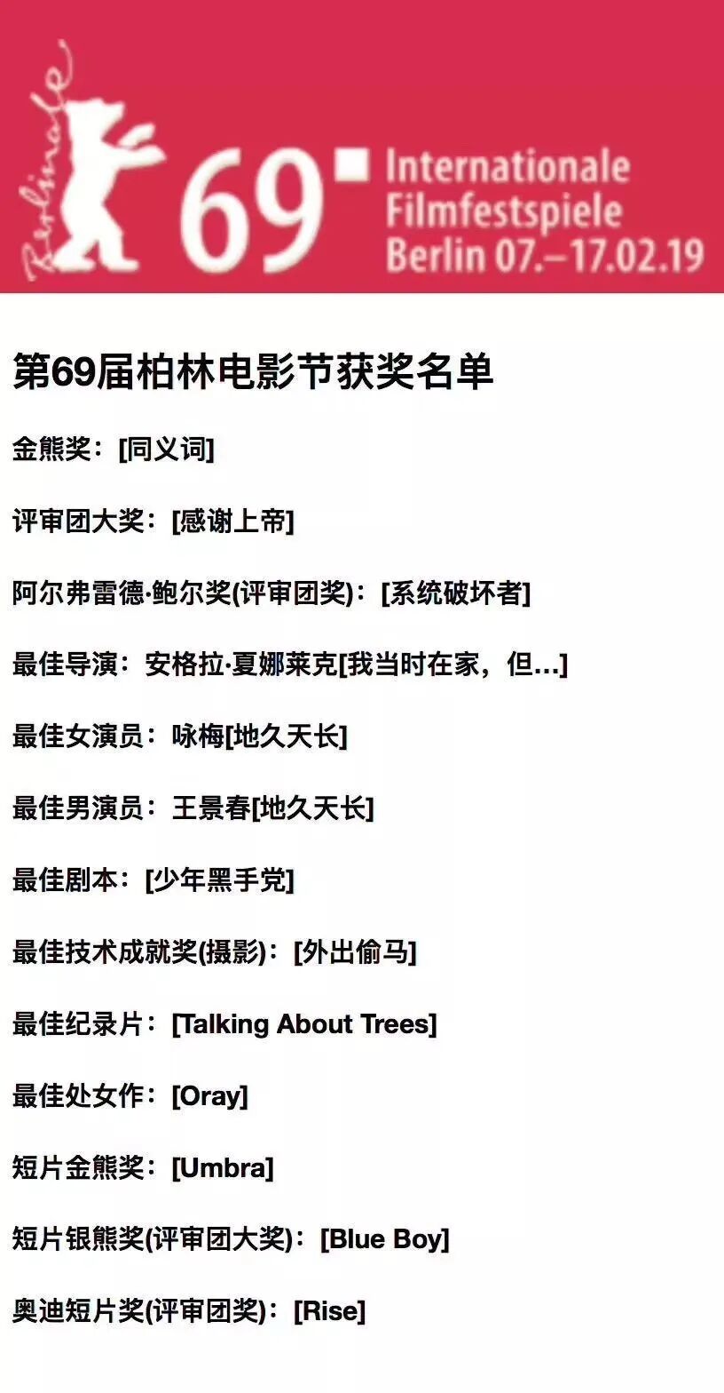 这是继2011年《纳德和西敏:一次别离》、2015年《45周年》之后,又一部电影同时拿下柏林最佳男女演员奖项的影片,这也是中国演员首次包揽柏林电影节的影帝影后。