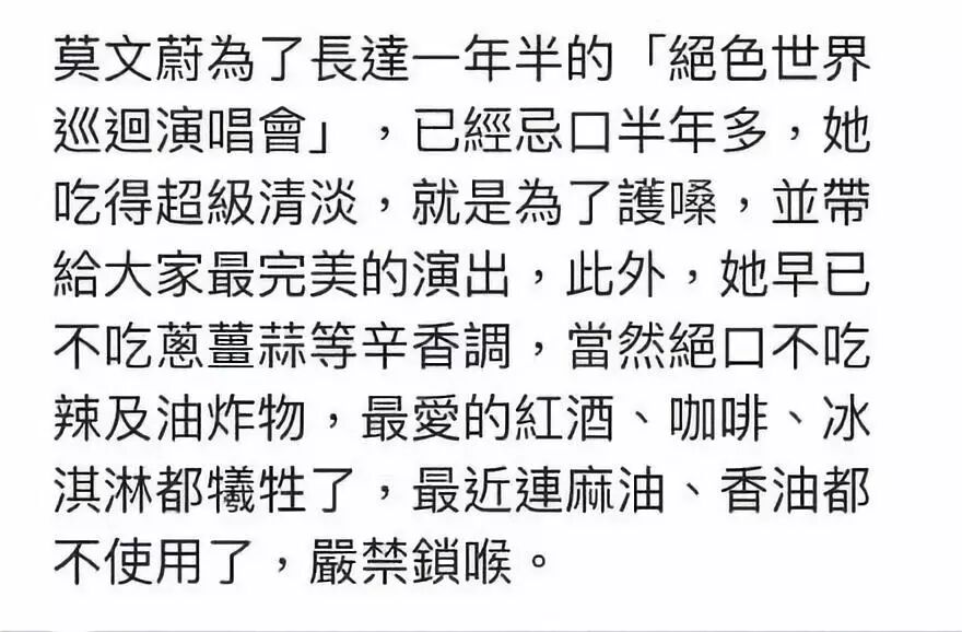 为了准备长达一年多的演唱会,保护嗓子和呈现最好的状态,莫文蔚爆出的食谱更是近乎苛刻:绝口不吃辛辣油炸食品,戒掉了最爱的咖啡、红酒、冰激凌,吃得清淡到连葱姜蒜和香油等调味品都不碰……