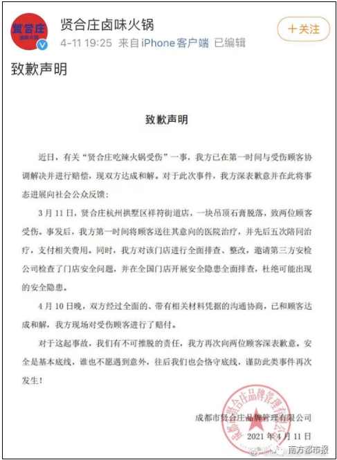 2021年3月11日,贤合庄卤味火锅杭州一门店的天花板突然掉落,砸伤正在吃火锅的夫妻。