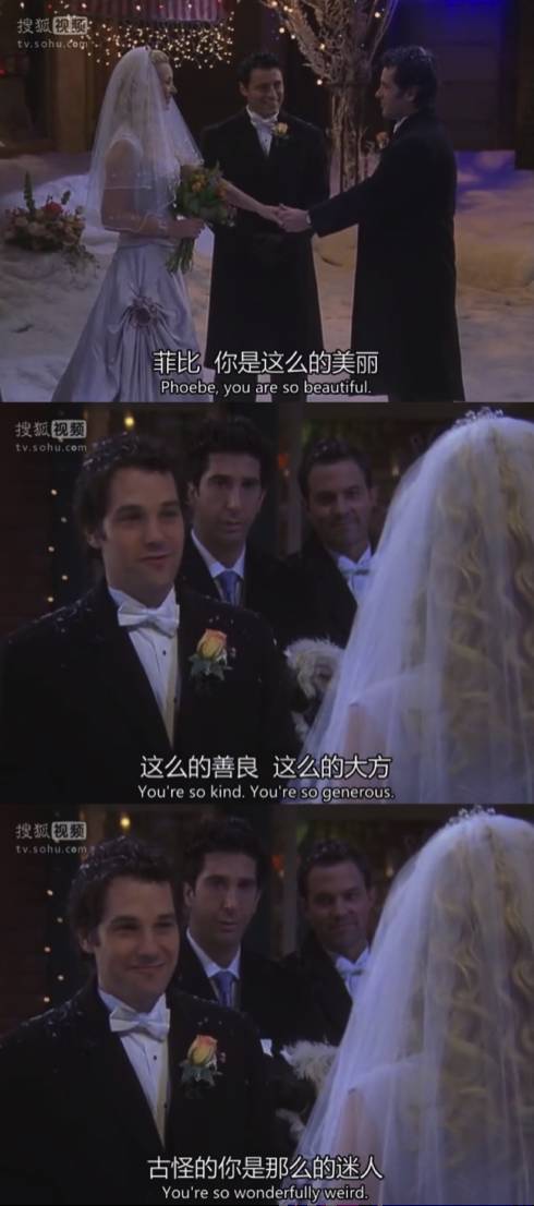 老友记里每一个都不是完美的,每个人的性格里都有让人难以忍受的部分,可是每个人又是那么的真诚可爱。其中数Phoebe首当其冲、一度让Vicky老师觉得如果朋友中有这样一个古怪的人是a lot to take,可是当Michael和Phoebe举行婚礼的时候,Michael在誓词的时候说“you’re so wonderfully weird”,我就知道Phoebe真的找到她的真命天子了。