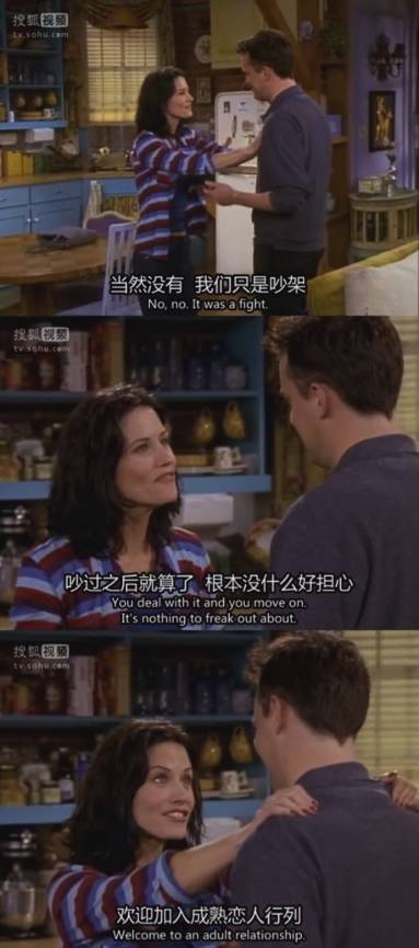 虽然这句话更多apply在Chandler和Monica的这段relationship上,但是让Vicky老师印象深刻的是,老友记里面六个人之间并不是毫无争吵,但是就在一切闹到不可开交、无法收拾的时候,他们总能不计前嫌原谅对方、雨过天晴。