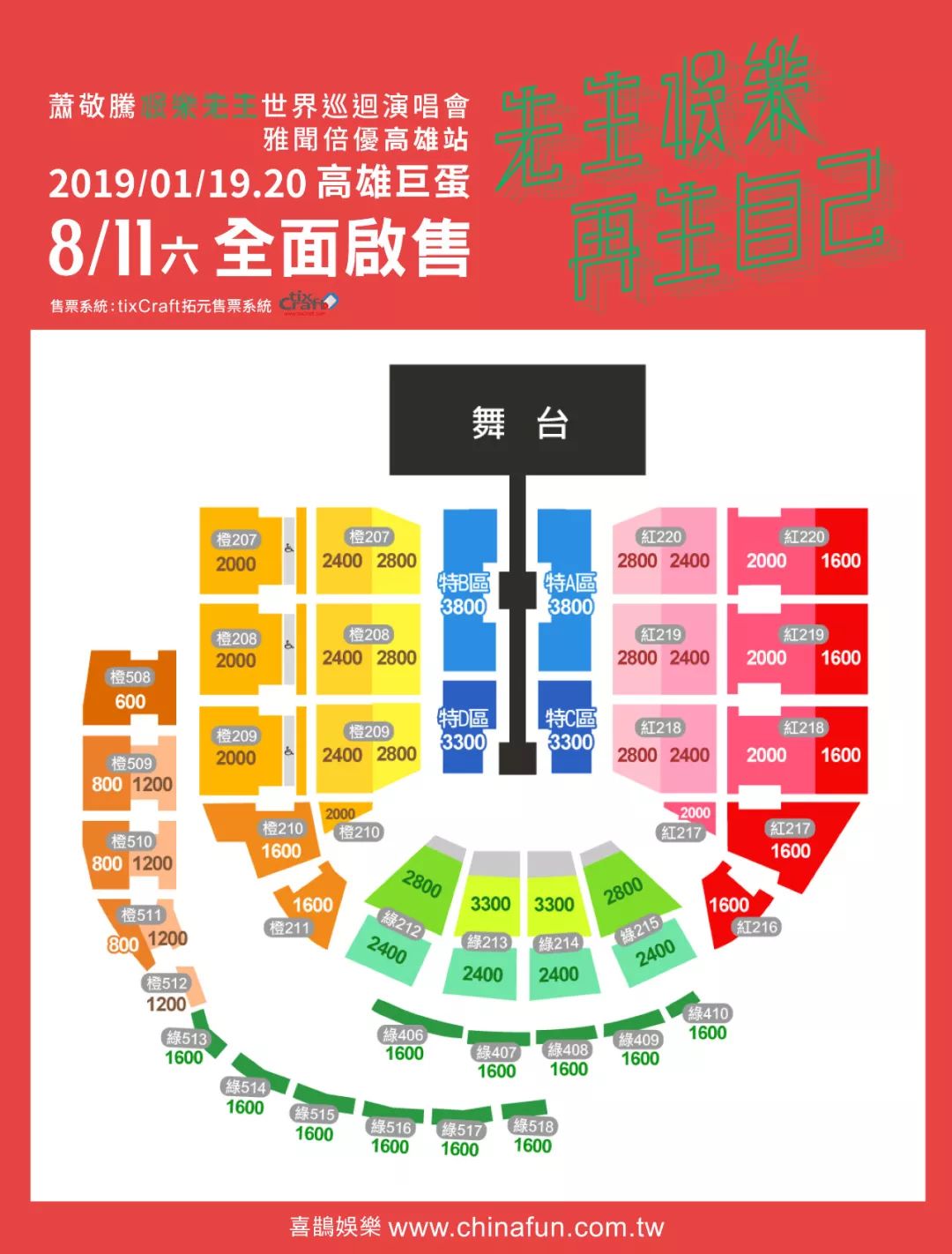 NT$ 3800 / 3300 / 2800 / 2400 / 2000 / 1600 / 1200 / 800 / 600(全座位,对号入座)