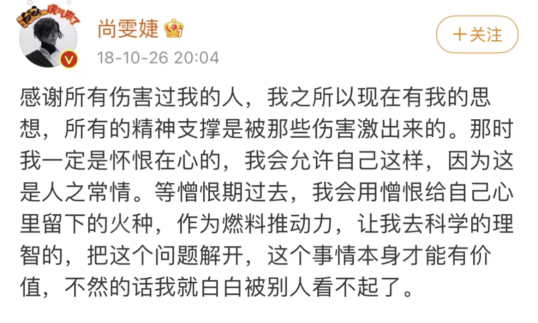 尚雯婕,争议缠身 周冲的影像声色 内地女星 2022-05-09 20:30:15 179 创作不易,用心坚持,欢迎请BaGua喝几杯爱心咖啡!打赏并支持本文 打赏并删除本文 人的性格是扎根在骨头里和血液里的。——高尔基落空。再落空。 每到选人环节,留给尚雯婕的,仅剩一地尴尬。 想要的人,她留不住。 放手之后,又恶语相向。 这就是她的处境。 乐队选人第一轮。 周洁琼一袭红衣,犹抱琵琶半遮面。 中式美感,国风演绎。台上古典,台下外放。 尚雯婕瞬间被吸引:“就是她了。” 玩摇滚的张震岳,也属意这位小琵琶精。 周洁琼陷入两难。 一边,是方才结识的好友。一边,是崇拜已久的偶像。 时间的指针啪嗒转动,约莫过了一个世纪那么久。 周洁琼选了后者。 尚雯婕并不甘心,势必要将周洁琼抢走。 “已经组队成功的能抢吗?” “我想选周洁琼。” 华少诧异。 连问了两遍: “你想和周洁琼搭档?” “你要周洁琼放弃张震岳?” “对。” 综艺效果达到了,被选者却苦不堪言。 周洁琼化身“纠结琼”,在现场接连表演哀嚎、跪地、打滚…… 最后怯怯地说:“我不改了。” 镜头扫到坐席区。 尚雯婕奉上白眼。 尚雯婕不理解,自己如此欣赏,对方为何不买账? 这份拒绝,让她耿耿于怀。 第二轮选人,二人接连落单。 周洁琼这回很自觉,主动站到尚雯婕身旁。 尚雯婕斜眼看了看,面色冷峻地抛下一句:“你拒绝了我。” 再一扭头,笑意盈盈朝张楚、阿朵发出邀请。 徒留周洁琼在原地,面如死灰。 所到之处,硝烟弥漫。 这不是尚雯婕,第一次让人尴尬。有一期《王牌对王牌》,邀来06届超女。 久不得见,尚雯婕泪洒现场,几度哽咽。 到这时,还是观众们,喜闻乐见的大团圆场面。 下一秒,尴尬袭来。 尚雯婕感慨,节目结束之后,渐渐失去联络,大家聚会都不请她。 许飞一听怒火中烧。 “微博私信过你,你从来不回复。” 唐笑也在一旁补充。 “我们总是没有你。” 事后,诸多细节流出。 许飞说,参加活动,几次相逢,她想加尚雯婕微信,对方皆以没带手机为由,给拒绝了。台下形同陌路,台上姐妹情深。 这种尬事,尚雯婕常有。 另一档节目里,尚雯婕和张艺兴同为导师。 节目有淘汰环节。 有一期,两组选手同台,争取晋级名额。 彼时,选择权归张艺兴所有,他留下了自己欣赏的一组。 镜头往台下一扫。 尚雯婕先是黑着脸,听到结果后,愤愤不平地离开了现场。 留张艺兴站在台上,不停自我怀疑:“我是不是做错了什么?” 让张艺兴下不来台算什么,尚雯婕,连李谷一都不放在眼里。 原创文化传承类节目,凭着“真性情”,她又火了一把。 说好的非遗文化,被尚雯婕融合法语来演唱。 评委席的李谷一,指出弘扬非遗文化时,不应以国外文化为主导。 尚雯婕却不屑。 一意孤行地认为,世界音乐更能引起共鸣。 音乐无国界没错,但也要分清场合。 听不进建议,容不下他者。 学不会委婉,更没有迂回。 在尚雯婕的世界里,自我就是唯一的答案。 1982年。尚雯婕出生。 家住破败弄堂,父母都是工人。 家贫。邻居低看。 加上她不是被爱的孩子。 一系列因素下,她成为一个敏感、偏执、习惯逃离的人。 当《超级女声》来到尚雯婕面前,她报了名,稀里糊涂中当上冠军。 手拿捧花,站在台上。 看着金光彩条,从天而降。尚雯婕心想:“凭我的资历,我的脑子,区区娱乐圈,不成问题。” 然而,娱乐圈靠的不是孤勇。 更挑战的,是做人的情商。 而这正是她缺乏的。 一次采访,记者问她:“平时都看什么节目?” “我只看TV5。” 台下一片嘘声—— 傲慢。显摆。优越感爆棚。 初涉娱乐圈,头顶三宗罪,她傻眼了。 尚雯婕不懂,自己法语系毕业,看TV5学法语,哪里奇怪呢? 几番添油加醋,成了娱乐圈怪人。 公司一看,这么下去也不是办法,隔三岔五把她拉到会议室。 一遍遍教,一遍遍骂。 情况好,叫开小灶。情况坏,叫批判会。 到后来,尚雯婕更不会说话了,有时跟人正常沟通,双手忍不住直抖。 不会说话,没通告。机会寥寥。 造星时代,很多人,一夜成名。 也有人,入行即巅峰,之后寂寂无闻。 属于尚雯婕的,是后者。 退路全无,她索性向前。 以背负数百万债务为代价,尚雯婕解约,出走,一步步夺回主动权。 没有歌唱,她自己写。 没有人看,就逼你看。 尚雯婕清楚,比谩骂更可怖的,是无人在意。她卯足了劲,在外形上苦下功夫。 暴瘦30斤。 凭雷人造型几度出圈。 她又红了,也比过去更招骂了。 博眼球。没底线。丑人多做怪。 但尚雯婕并不在意。 对于一个渴望名利的人而言,用挨骂换来热度,显然是利大于弊。 “骂我不要紧,骂完了能听听我的音乐,就够了。” 与此同时,尚雯婕还学会了妥协。面对采访,有的放矢。面对谩骂,心态放平。面对音乐,行远自迩。 她换风格,搞创作,开公司。 如鱼得水,一蹴而就。 只是,人世无常。 谁也没料到,当初的屠龙少女,最终成为了恶龙。尚歌手,声名鹊起。 尚老板,却命途多舛。 重新出走之后,尚雯婕与聂心远,合伙成立了公司。 签艺人,捧男团。 送去拍戏,参加选秀。 看似风光无两,如日方中。 平静之下,暗流涌动。 很多人好奇,为何这家公司屡屡被骂?一纸合约如照妖镜,将人性的贪婪、肮脏与丑陋,暴露无遗。条款之上,写满剥削二字。签约前三年,艺人与公司分成1:9。 每个月给艺人6000生活费,成名之后全数归还。 如要解约,免不了天价违约金。 公司成立没几年,与旗下艺人矛盾频出,官司不断。蒋佳恩
