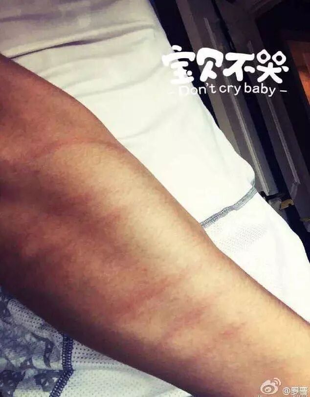 隔天罗晋就发微博安慰“宝贝不哭”,虽然配图说是因为自己跳绳弄伤手,但是跳个绳把手臂跳成这样也是欺负观众智商,再者就算真伤到了,一个大男人有啥好哭的。