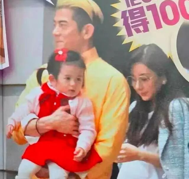 当天的郭富城一头黄色的头发,穿着黄衬衫很抢眼,手上抱着女儿,女儿穿着红色的裙子,头上还戴了一朵小红花,非常可爱。而方媛也大着肚子走在一旁,小心翼翼的。