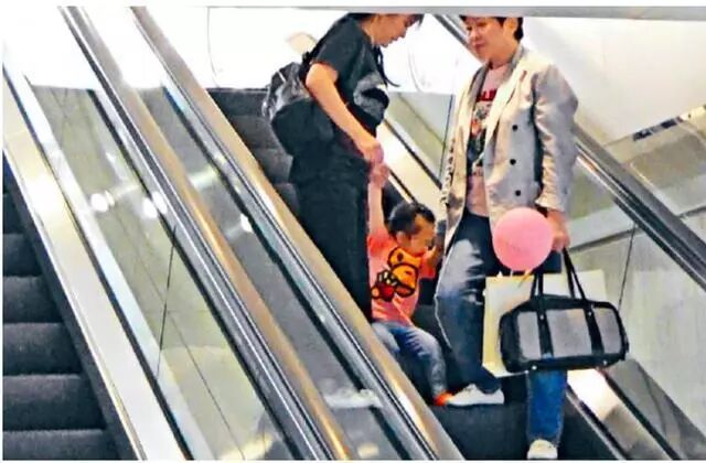 另一张照片可以看到,在三人坐电梯的时侯,小姑娘可能是太累了,任性地一屁股坐在地上。