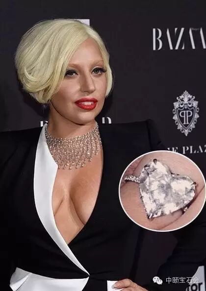 Lady Gaga的这枚心形钻戒足足有10克拉,价值77.5万美元,戒环内侧刻上了她和男友泰勒·金尼的名字缩写首字母“T”和“S”。