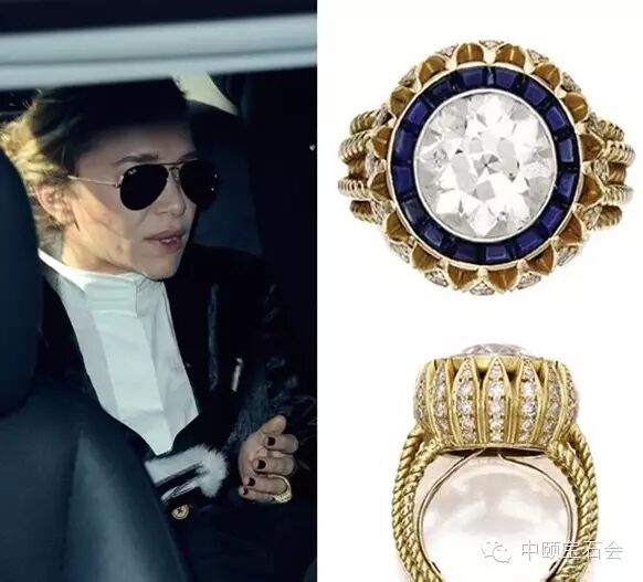 奥尔森姐妹中的妹妹玛丽·凯特·奥尔森收到的这枚4克拉钻戒是由16颗蓝宝石围绕中心钻石组成,它被购买于纽约的苏富比拍卖会上,大约7.5万美元。