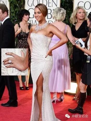 碧昂斯对于男友Jay-Z送给她的钻石戒指非常满意,红毯上的她也不忘随时在镜头前展示这枚幸福指环,据说这枚18克拉的戒指价值高达500万美金。