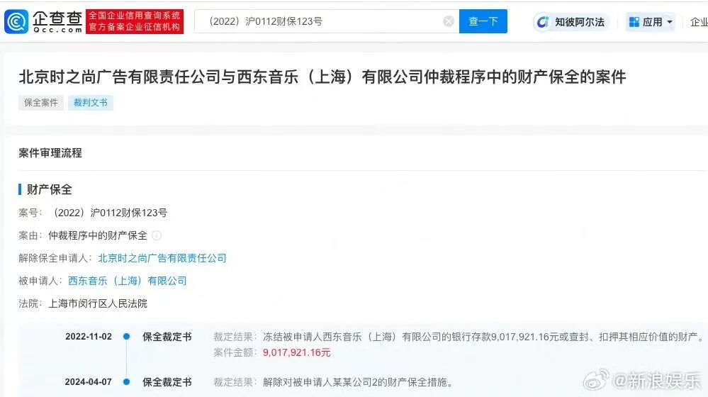 据企查查显示,法院解除对王力宏公司西东音乐(上海)有限公司财产保全措施。裁定书显示,经法院审查认为解除保全申请人的申请符合有关法律规定,解除对被申请人的财产保全措施,裁定立即开始执行。