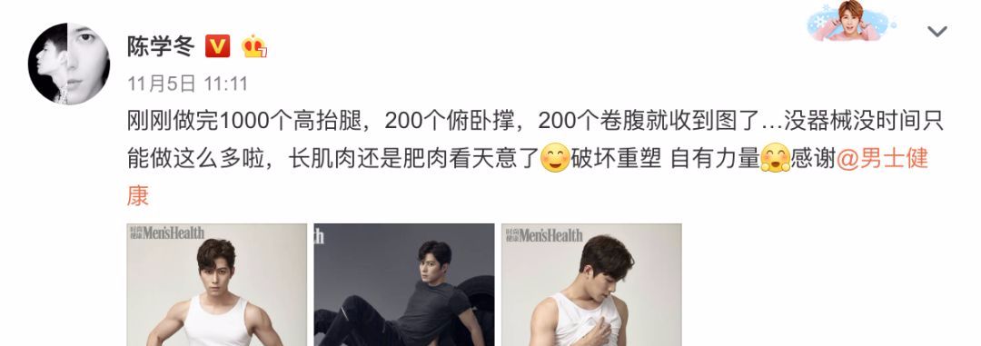 陈学冬在微博中表示,他是在刚做完1000个高抬腿、200个俯卧撑、200个卷腹后,收到本次拍摄成品图的。由于平时工作忙,工作的地方点又缺乏器械,所以暂时只能进行徒手训练了!