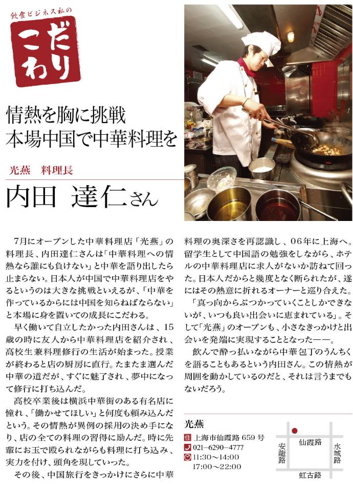 今年34岁的内田达仁,是上海一家名叫“光燕”的中华料理店的老板兼主厨。