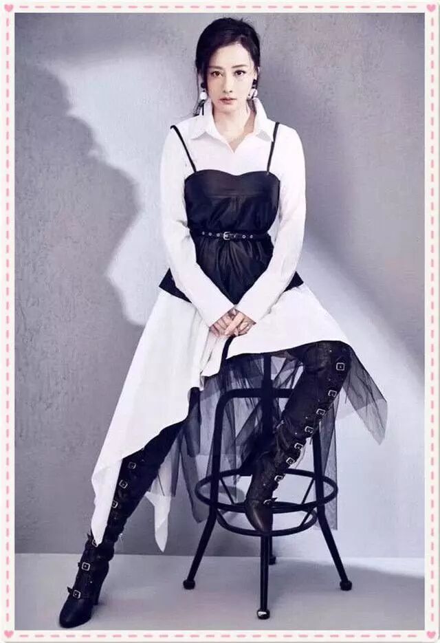 一身白色的衬衫比较优雅大气,不规则的衬衫裙摆很随性,拼接黑色的薄纱给人一种很甜美的感觉,黑色的高跟鞋霸气加分。