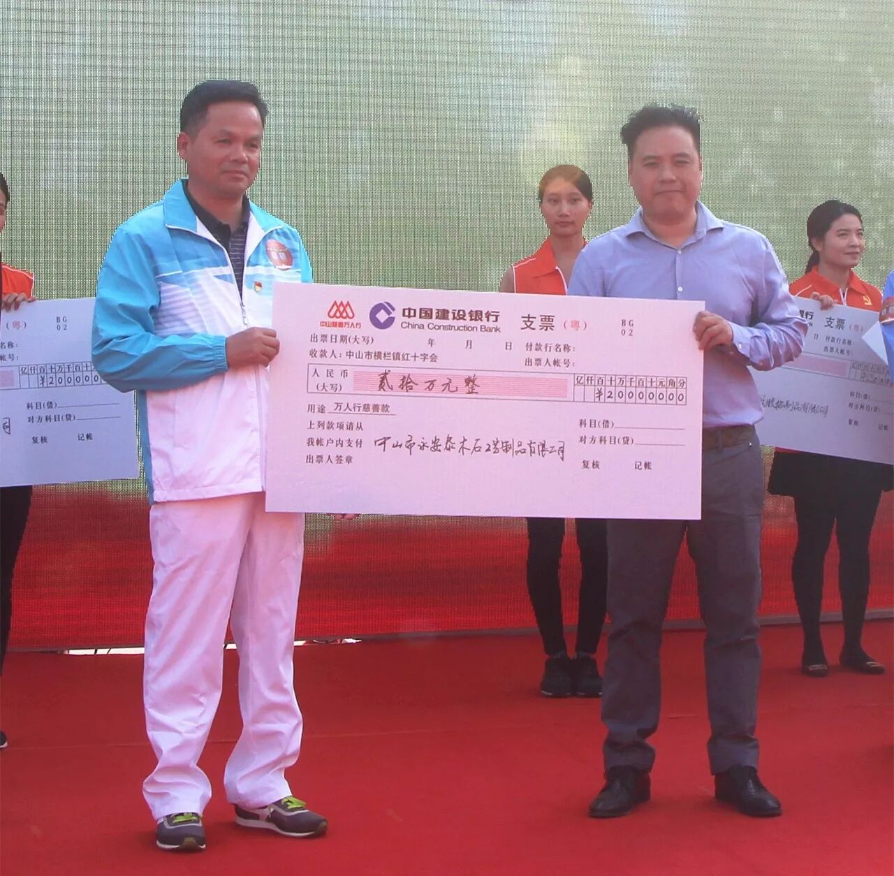 仪式上,镇党委委员、副镇长、镇红十字会会长梁添保与捐款10万以上的企业代表进行了支票交接仪式。