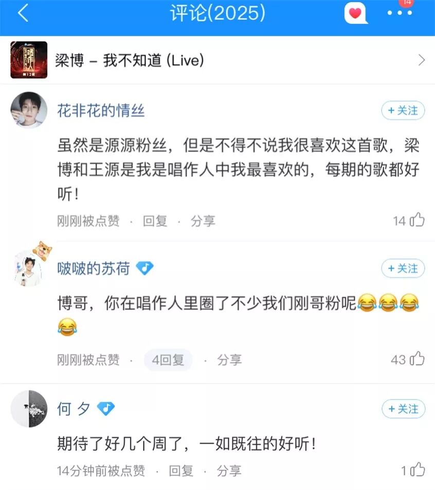 其中,梁博凭借《我不知道》圈了好一波粉。这首歌是写给经受了网络暴力的朋友们,“星星和月亮一起闪耀 驱散了孤独和寂寥 洒向黑暗的每一秒 也会把你照耀”,梁博磁性的歌声仿佛化作了阳光,洒落在听众的身上,治愈力Max!