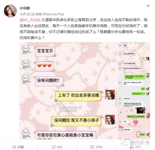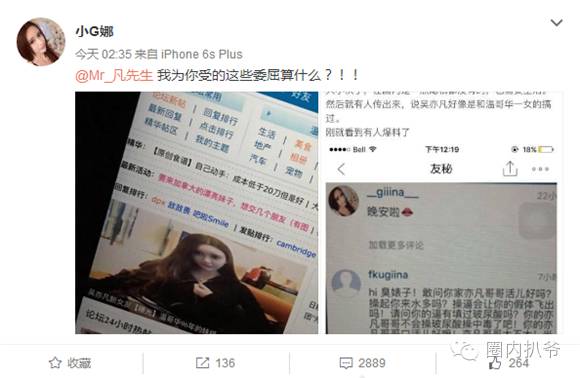 最早是有小G娜发出与Wuli凡凡的聊天记录,记录当中Wuli凡凡与对方调情的片段比比皆是,而且这位小G娜还以“吴亦凡女友”自居。