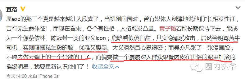 关于exo回来这三只,其实扒爷还是最佩服耳帝的点评,尤其是鹿晗的那条, 明着骂黄牛,其实是骂私生饭,真心情商高。
