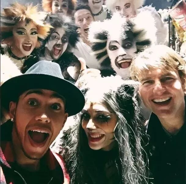 英国赛车明星刘易斯·汉密尔顿(左)和你们的阿汤哥汤姆·克鲁斯(右)和群猫自拍的心情不能再灿烂