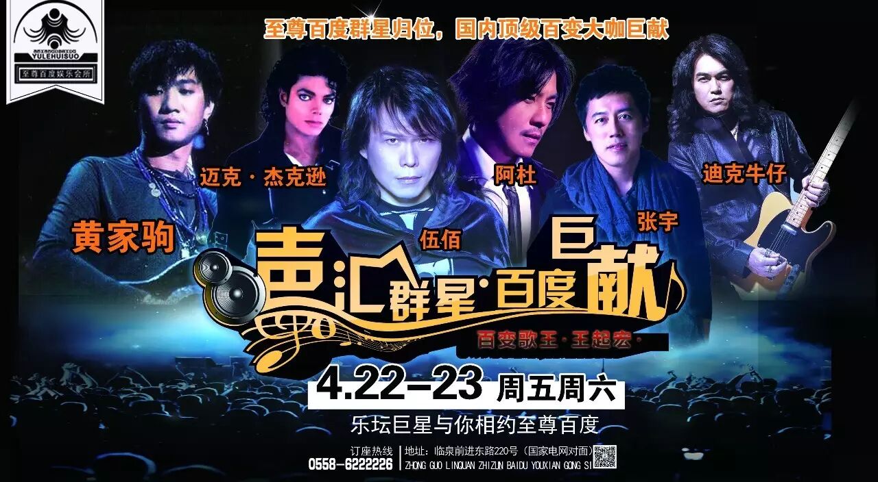 黄家驹、阿杜、伍佰、张宇、迪克牛仔、迈克·杰克逊来了你信吗?至尊百度百变大咖重邀多位容一身国内百变大咖之王《王起宏》至尊百度现场为您演艺,让您感受巨型演唱会火爆氛围。2016年4月22日23日两晚我们不见不散!