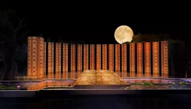 今年的舞台元素取自山东曲阜本地,比如在具有儒家文化特色的竹简,具有曲阜当地代表性的阙楼、荷花以及柏树,以竹简为主,柏树为辅,每年的“中秋月圆”的圆形屏幕继续保留,组成了舞台的主要构成。