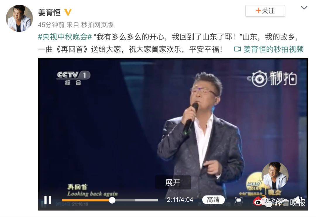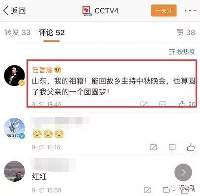 除了《山东新闻联播》主播李毅,在主会场主持的任鲁豫老家也是山东,日前,他还曾在CCTV4官方微博下互动留言,“山东,我的祖籍!能回故乡主持中秋晚会,也算是圆了我父亲的一个团圆梦!”