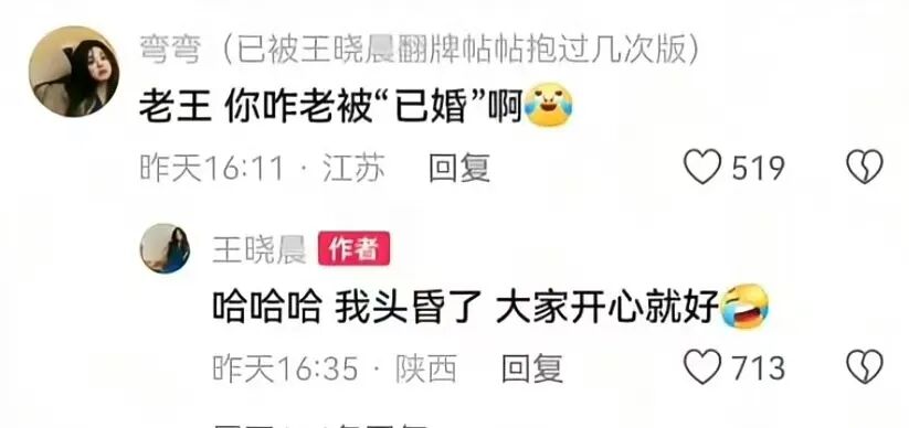 面对愈演愈烈的传闻,王晓晨的回应堪称娱乐圈 “高情商应对范本”。6 月 11 日,她在评论区回复网友 “老王你咋老被‘已婚’” 时,一句 “我头昏了,大家开心就好” 引发三重解读:支持 “承认派” 的网友玩起谐音梗,称 “头昏” 即 “头婚”;“否认派” 则认为这是对无厘头传闻的无奈调侃;更多中立网友则觉得,这是明星在隐私与舆论间的典型公关策略 —— 既不承认也不否认,给双方留足转圜空间。这种模糊态度与她过往 “与胡歌传绯闻后迅速澄清” 的风格大相径庭,反倒让事件更添悬念。