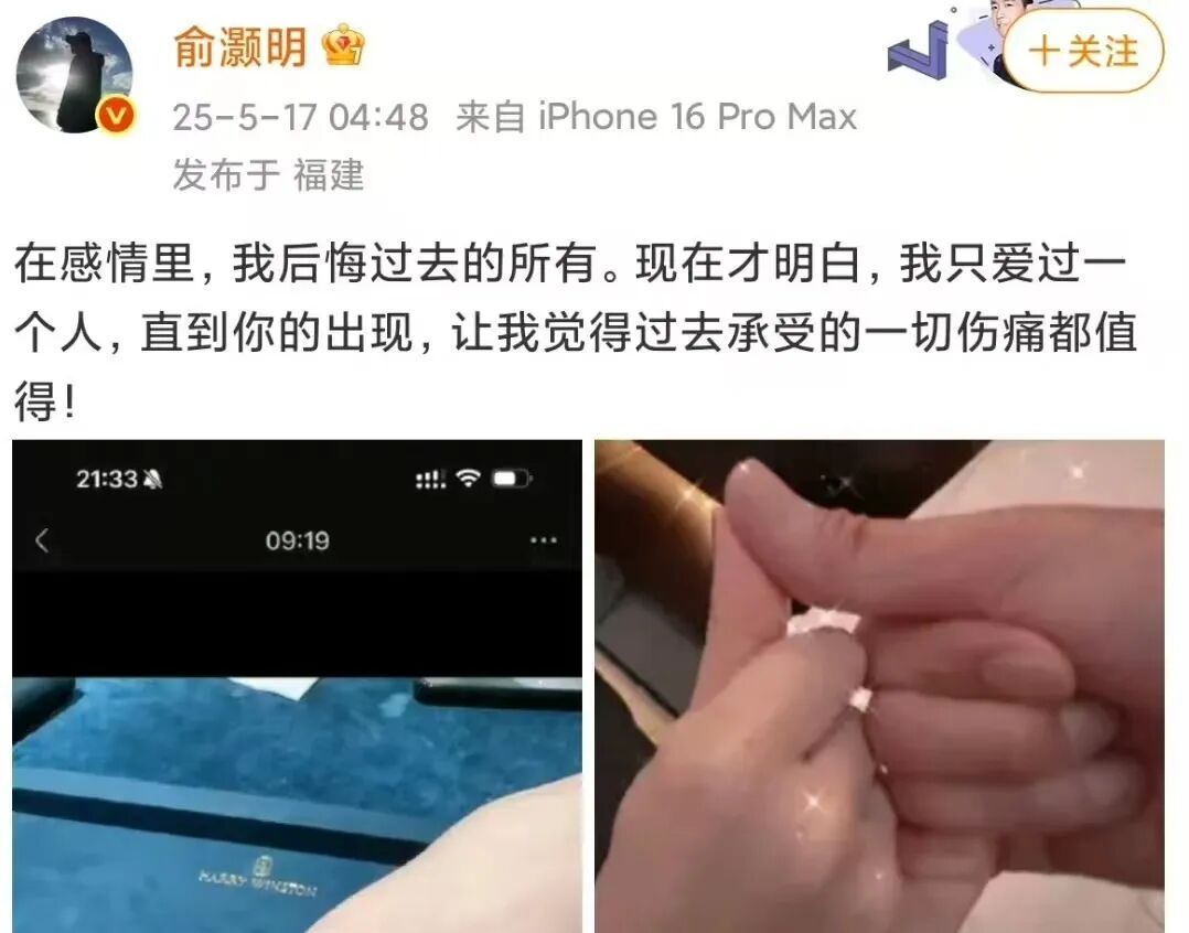 2025 年 5 月 17 日凌晨,俞灏明在微博晒出钻戒与手部拉钩的特写照片,配文 “直到你的出现,让我觉得过去承受的一切伤痛都值得”,一句 “晨,四个月了,我真的很想为你戴上那只真正属于无名指的钻戒”,将他与王晓晨的关系推向风口浪尖。这条被解读为 “单方面官宣结婚” 的动态,瞬间让 “俞灏明 王晓晨” 冲上热搜,而女主角至今模糊的态度,更让这场传闻成了娱乐圈典型的 “罗生门”。