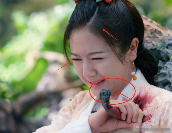 还有被匕首刺伤肩膀那,更是暴露了颜值的缺点,挤到变形的多层下巴、肿眼泡线条眼、油塌头,丝毫没了女主角的灵气。