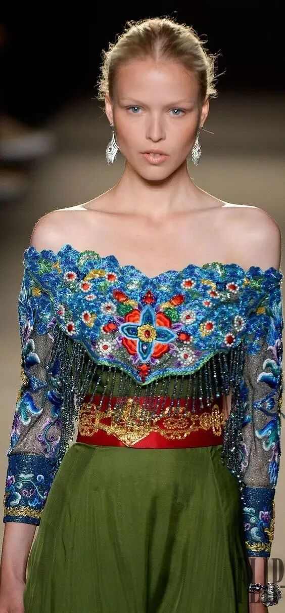 艳丽撞色、刺绣、旗袍领等元素的堆砌和叠加。
