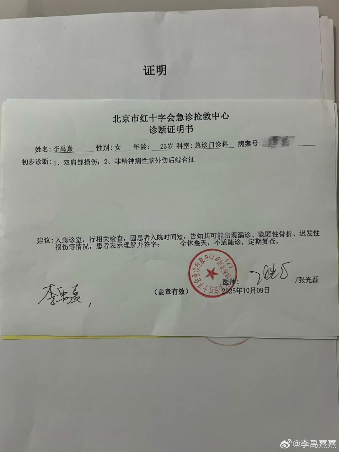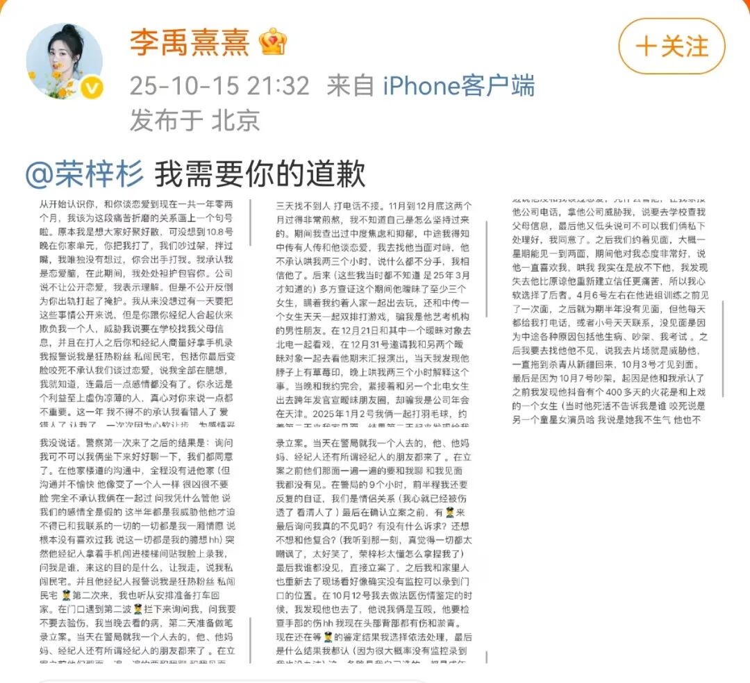 10月15日晚,李禹熹在社交平台发文称荣梓杉恋爱期间出轨打人,她一度被确诊中度焦虑和抑郁。