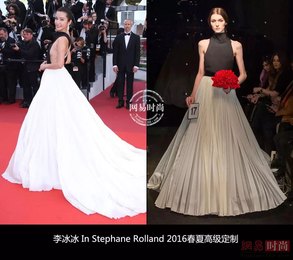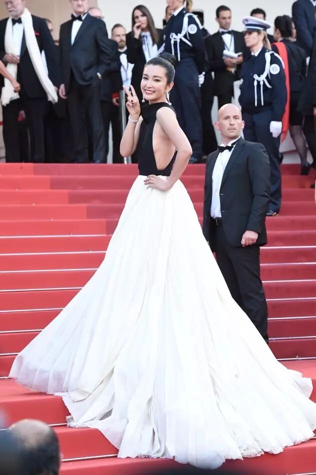 ▲李冰冰身穿Stephane Rolland 2016春夏高级定制礼服裙,简约却不简单,性感的黑色露背装配宽大白色裙摆亮相2016戛纳电影节。