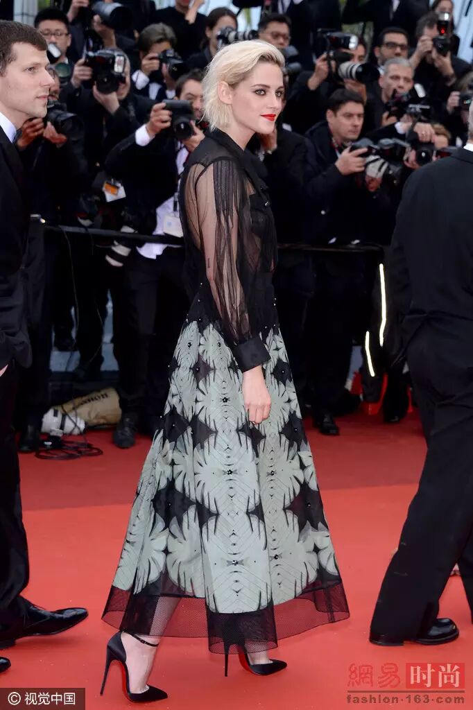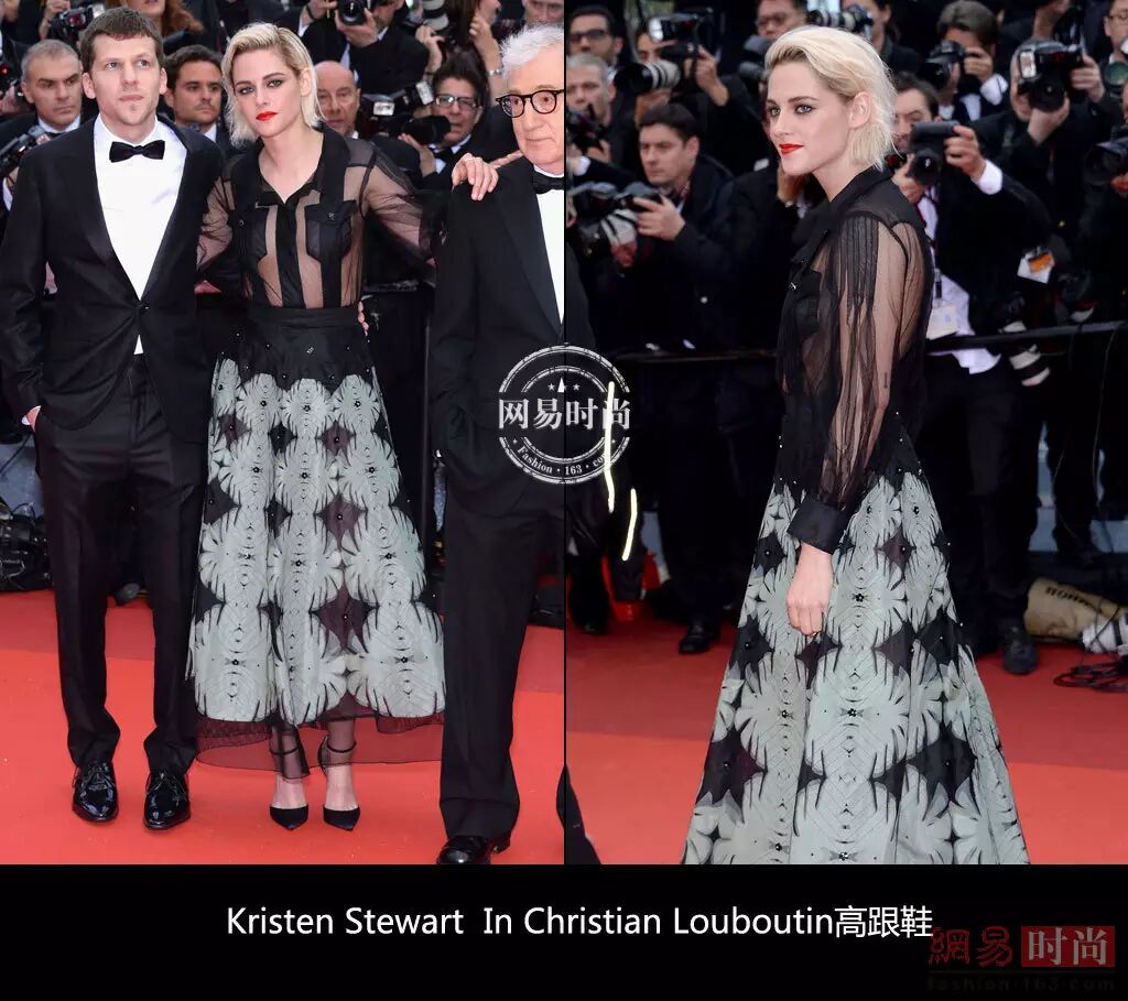 ▲一向不走寻常路的Kristen Stewart这次身穿黑色透视衬衫配印花伞裙脚踩Christian Louboutin绑带高跟鞋。