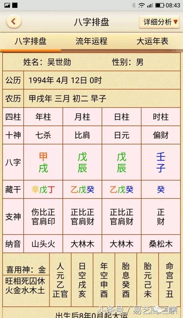 看吴世勋的命造,命元超旺,但演绎娱乐明星的命造须伤官食神泄身得力方可,吴世勋的命造须大运配合伤官、食神才可。否则命造看只是一个命理较好的二代而已。