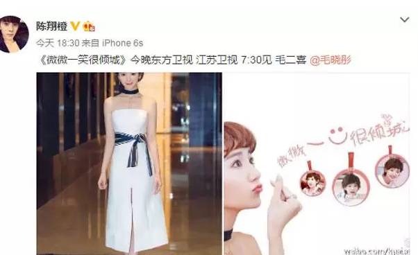 在毛晓彤《微微一笑很倾城》播出后,陈翔也第一时间在微博上为女票打起了广告。
