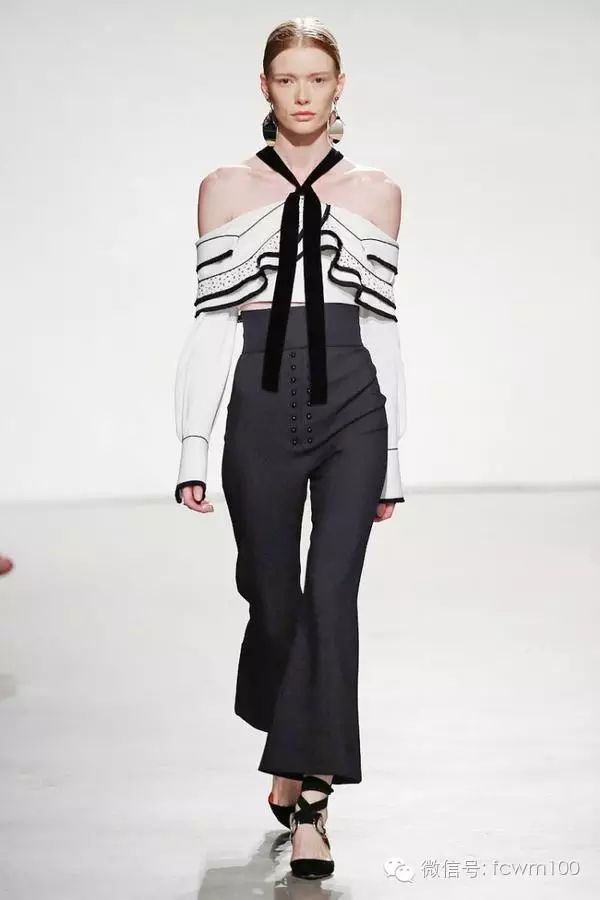 这件集合了多种时髦元素的露肩上衣来自Proenza Schouler 2016春夏成衣系列,模特用了黑色的高腰纽扣裤和绑带鞋搭配这件短上衣,造型上更加统一完整。