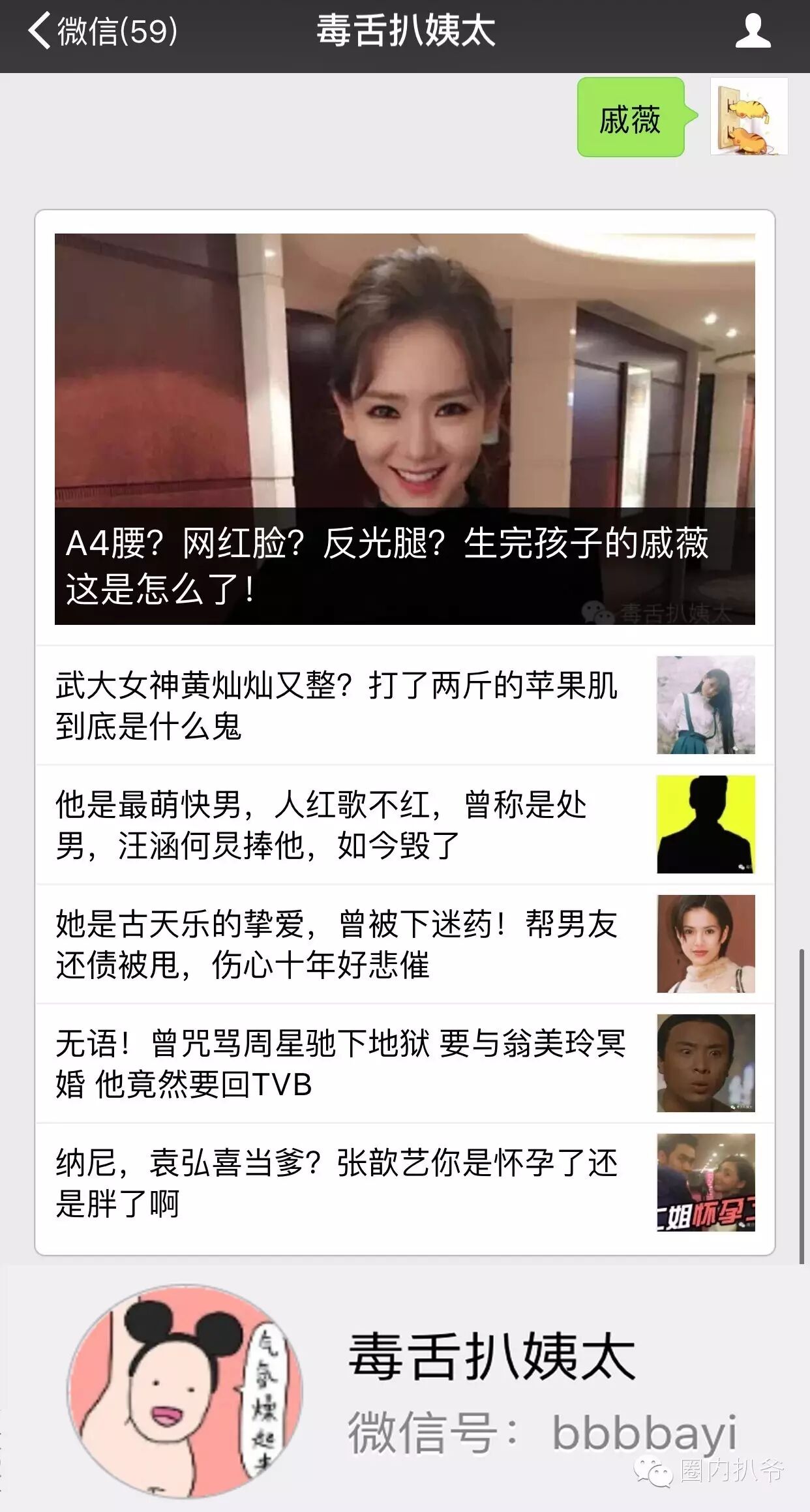看扒爷一个人讲八卦腻不?来关注扒爷CP,毒舌扒姨太吧!一手明星猛料,时尚小公举,最浪毒舌妇就是她! 关注后回复关键词:【戚薇】 就有猛料哦!