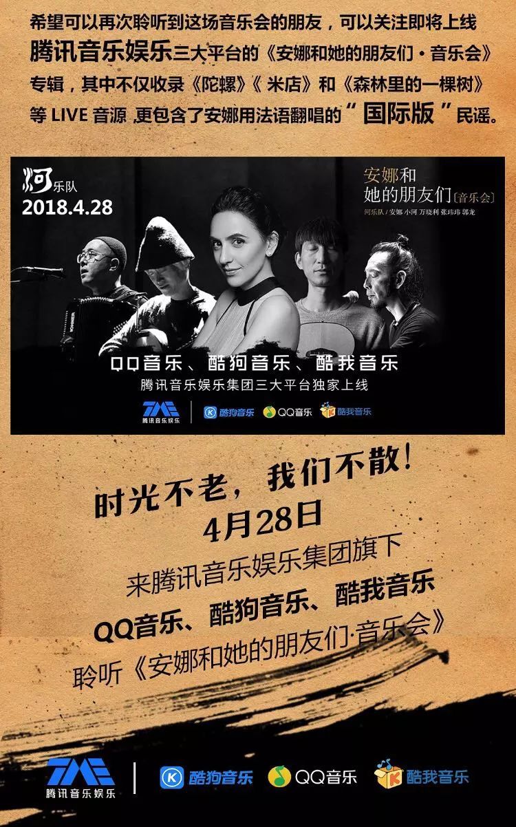 如今,那张取名《安娜和她的朋友们·音乐会》的现场专辑终于制作完成,并在4月28日正式上线腾讯音乐娱乐集团旗下QQ音乐、酷狗音乐、酷我音乐三大平台。这张专辑里面收录了中法双语重新演绎的经典之作《米店》、《陀螺》、《森林里的一个树》在内的13首歌曲,还有独家影像的MV+音乐会现场live视频,完美重现了那个美妙的夜晚——安娜与小河、万晓利、张玮玮、郭龙5人相识17年间的情谊,这就像是“民谣老友记”,甚至可以将这张专辑的上线理解为“民谣界纵贯线在腾讯音乐娱乐正式出道”。