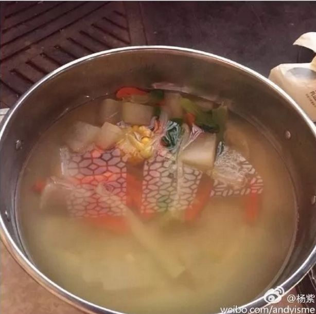 杨紫在减肥时期弄的减肥食谱也是够卖力了!清水煮蔬菜来一套,首先锅已经够丑了,这汤上面漂着的三片是塑料还是啥玩意?!看着就特别没食欲,减肥目标达成!