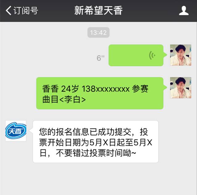 2、发送完参赛歌曲后,编辑您的“姓名+年龄+联系方式+参赛歌曲名”至“新希望天香”官方微信,以便香香及时与你取得联系。